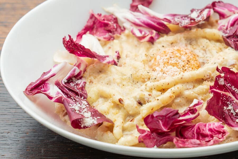 卵とクリームのソースにグラナバダーノをたっぷり入れ半熟卵をのせました
